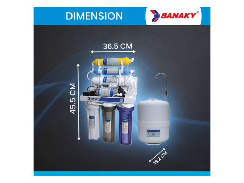 The Sanaky 100 GPD water purification system, manufactured in Vietnam, represents a high-quality and reliable solution for safe drinking water. Engineered for efficiency, this advanced model features a comprehensive 6-stage purification process that ensures the removal of impurities while maintaining essential water quality.